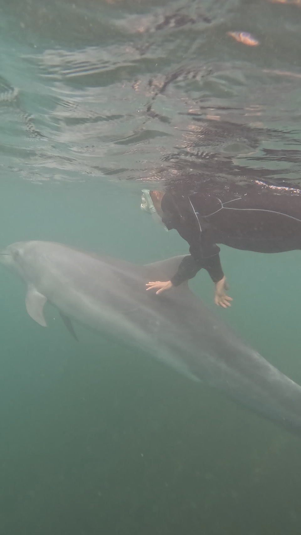 During dolphin snorkeling, I swam with Sky and the others.