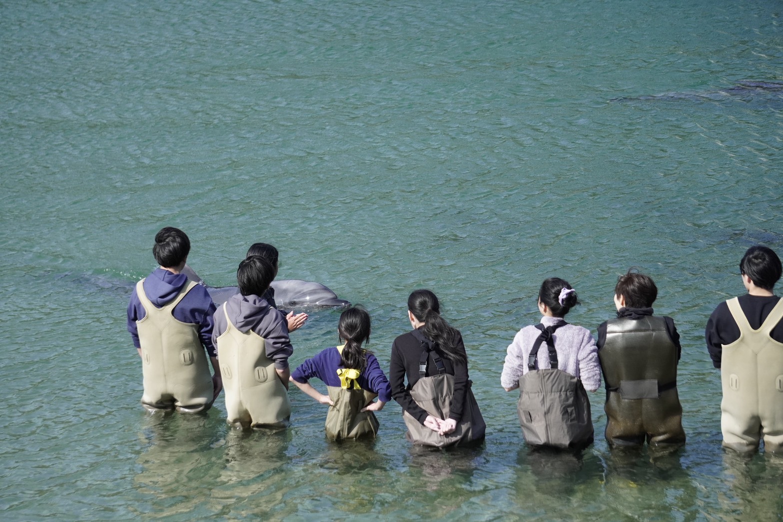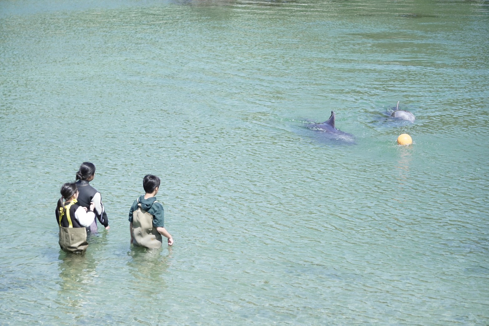 はじめは少し様子見をしていましたが、終盤には小魚の群れを散らすようにお客様の列の間を縫うように泳いでました🐟🐬