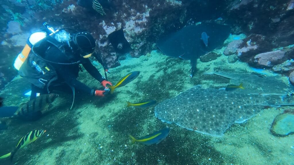 ドルフィンダイビングでは、レオの距離感がバグっていて、気付いたら顔が目に前にありました(笑)